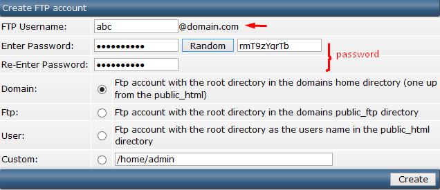 Điền đầy đủ thông tin và chọn Create để tạo tài khoản FTP .