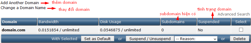 - Để suspend hay unsuspend 1 domain bạn tích chọn domain